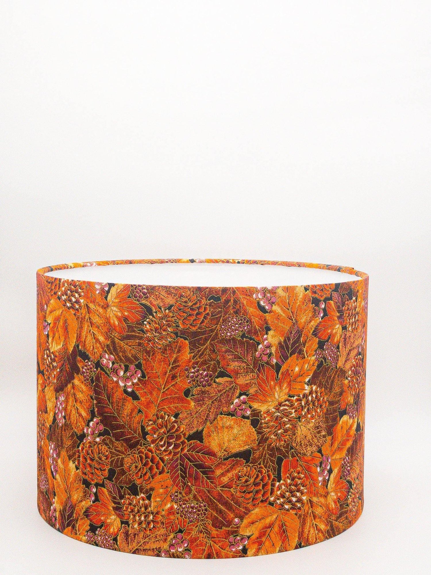 Bring the enchanting colors of autumn into your home with the Autumn Beauties of Pine Cones and Leaves Drum Lampshade. This stunning piece from Shades 4 Seasons is perfect for transforming any space into a cozy retreat. The vivid hues of orange and brown will complement the warm tones of your decor, adding a touch of seasonal charm.