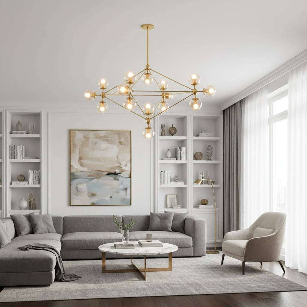 Hang the Fifteen Arm Pendant Light over a long dining table or in a grand entryway. Pair with gold or marble accents to echo its finishes, and keep surrounding decor simple to let the dramatic light installation remain the hero.