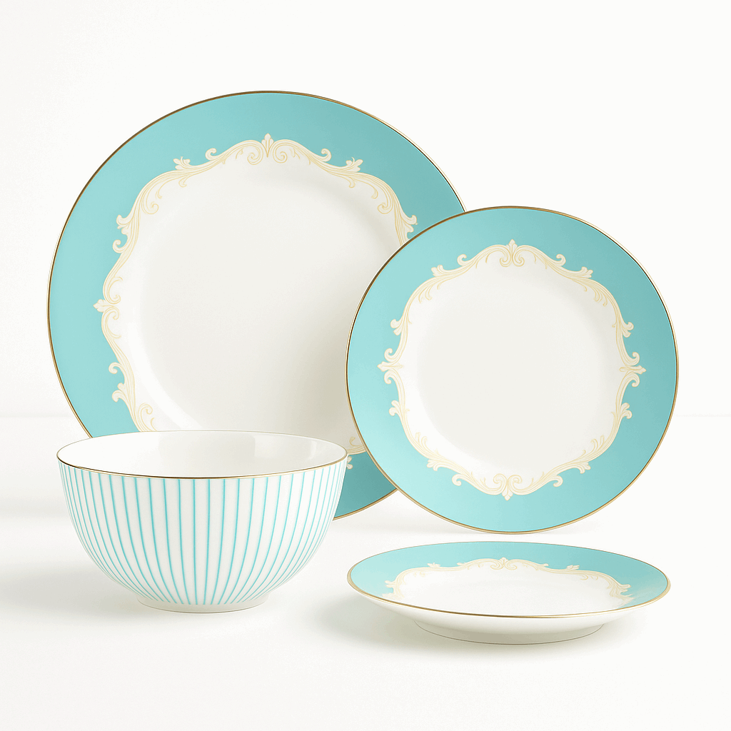 Elevate your dining experience with the Alba Royal Bone China Dinner Set, available in both 16 and 24-piece options. Made from premium bone china, this set is crafted for those who appreciate the perfect blend of elegance and durability. The design features a pristine white centre, framed by a delicate aqua-blue border with subtle gold accents, adding a refined touch to any table setting.