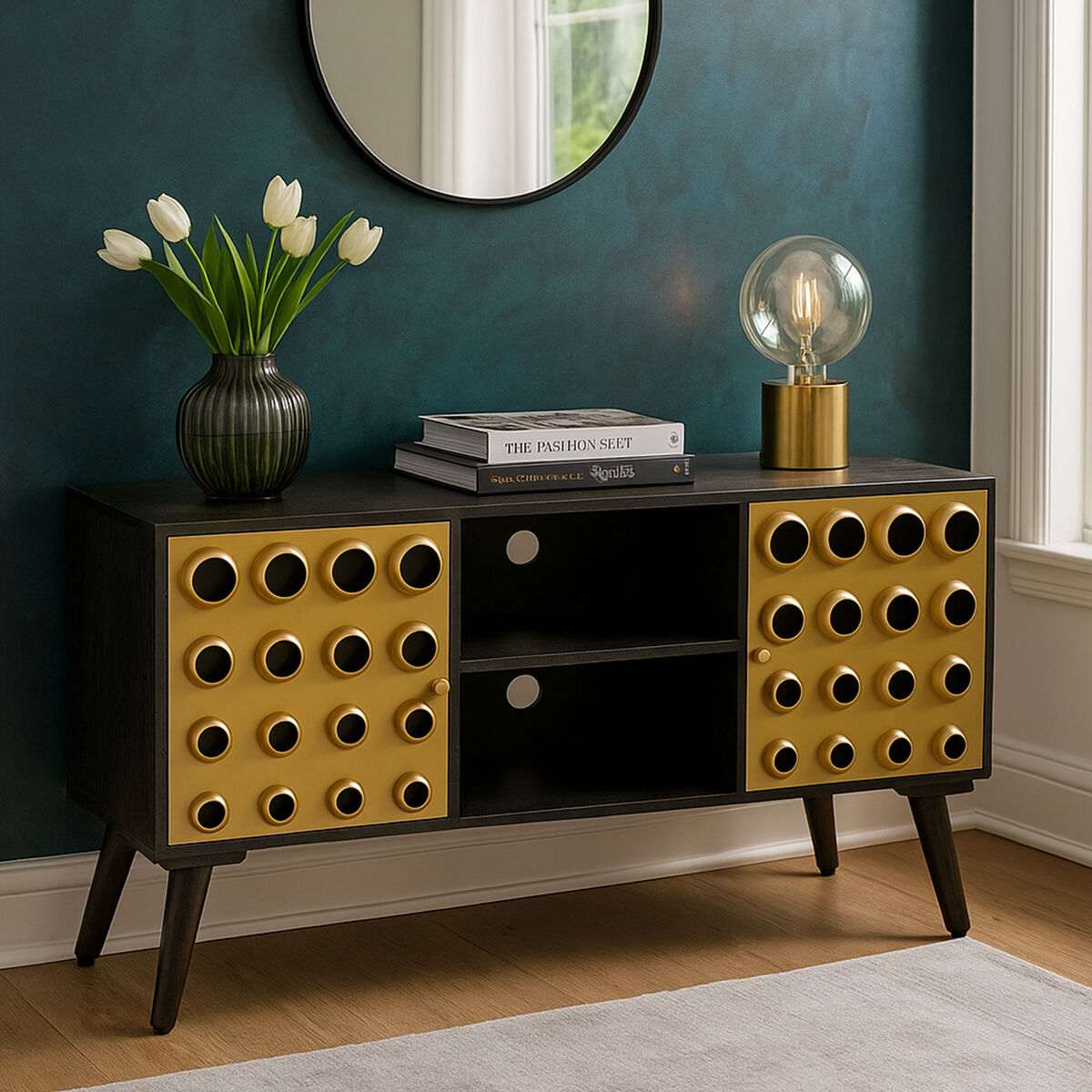 The interplay of dark wood grain and champagne-like metal circles brings depth to neutral rooms and pairs elegantly with stone, leather, and textured fabrics. Place a woven basket nearby for throws and turn your lounge into a restful retreat.