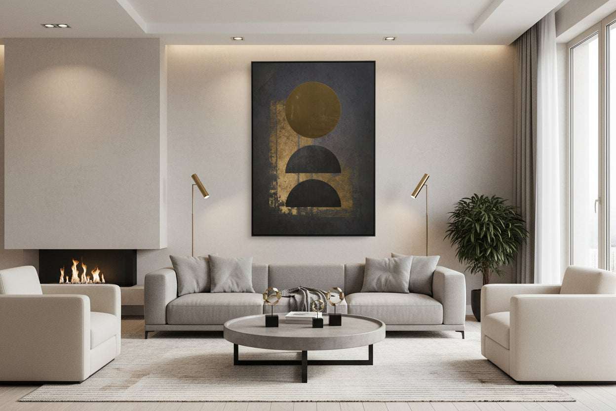 Place it above a sofa or console for an instant focal point, or centre it over a bed to anchor your headboard wall. The black ground pairs easily with stone, marble, and matte paint finishes, while the gold foil harmonises with warm metallic lamps and hardware.