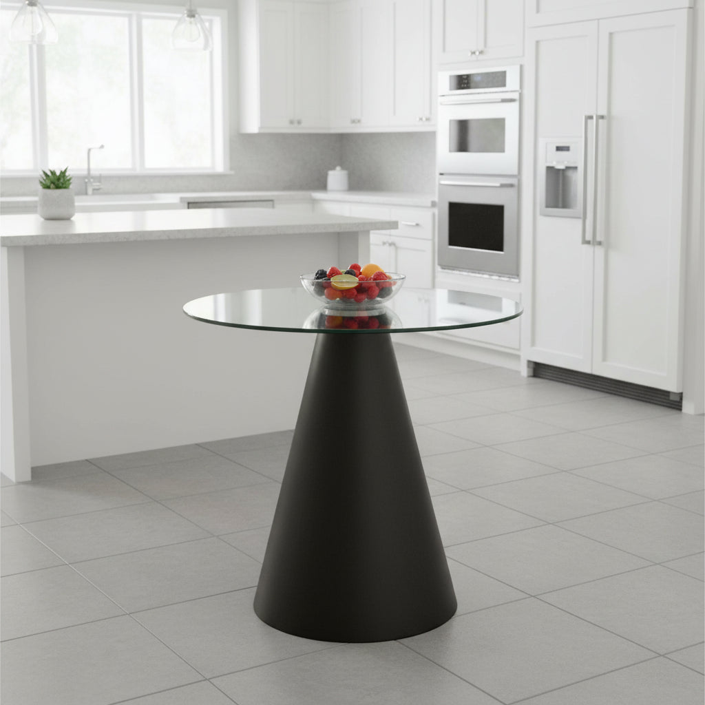 Set a sophisticated tone with the Azalea Round Clear Glass Top Dining Table, where modern geometry meets airy elegance. A perfectly round clear glass top floats above a smooth, black conical pedestal, creating a seamless silhouette that complements statement lighting and streamlined chairs.