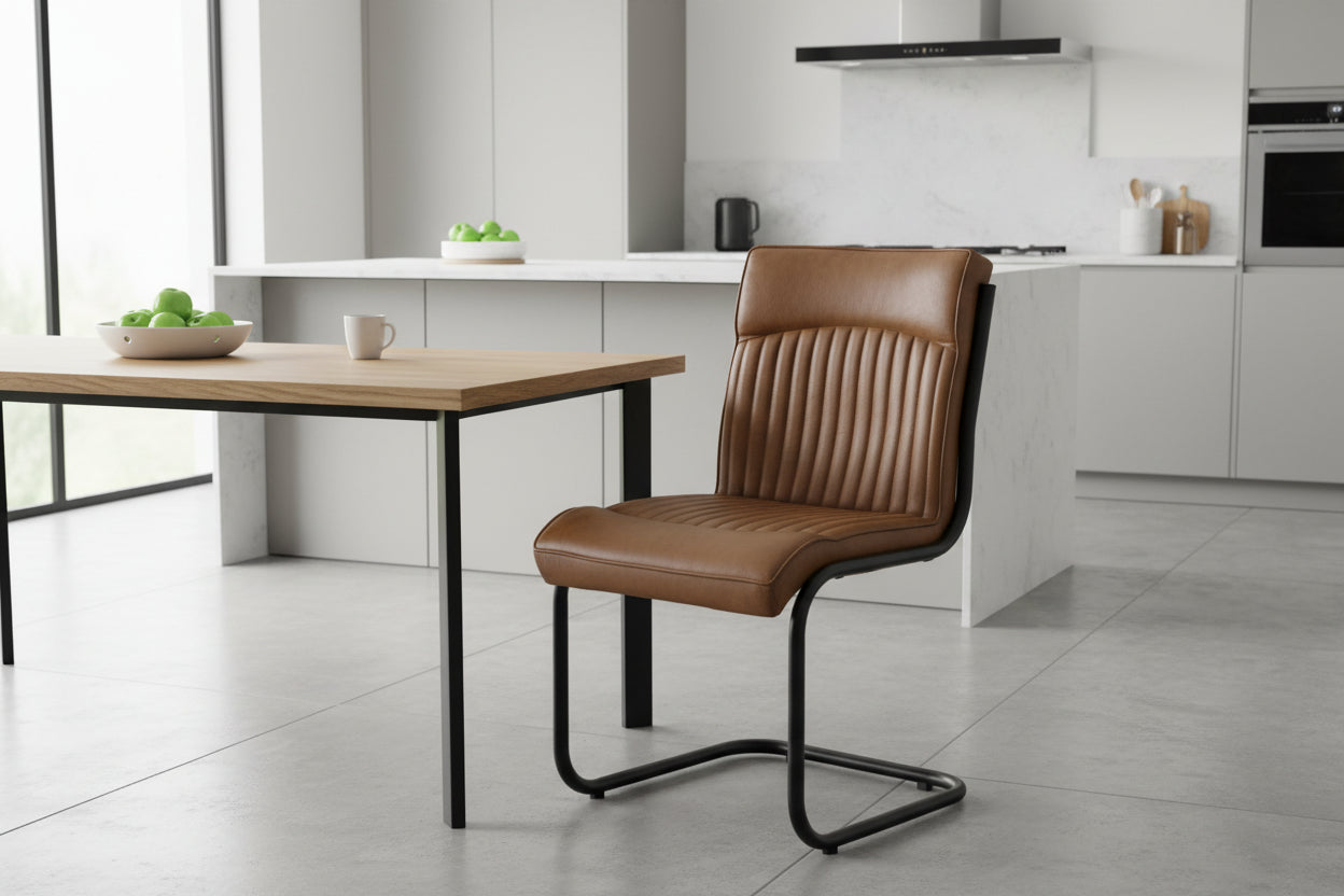 The Billy Leather Dining Chair boasts a striking silhouette that commands attention in any space. Its supple, caramel-hued leather upholstery exudes a timeless sophistication, while the sleek, black metal frame provides a modern contrast. The chair's distinctive vertical channeling adds a touch of industrial flair, making it a versatile piece that seamlessly blends with a range of interior styles, from rustic-chic to contemporary. Pair this striking chair with a polished wooden table for a cohesive look, or mix and match it with other industrial-inspired pieces to create a dynamic, eclectic dining area.
