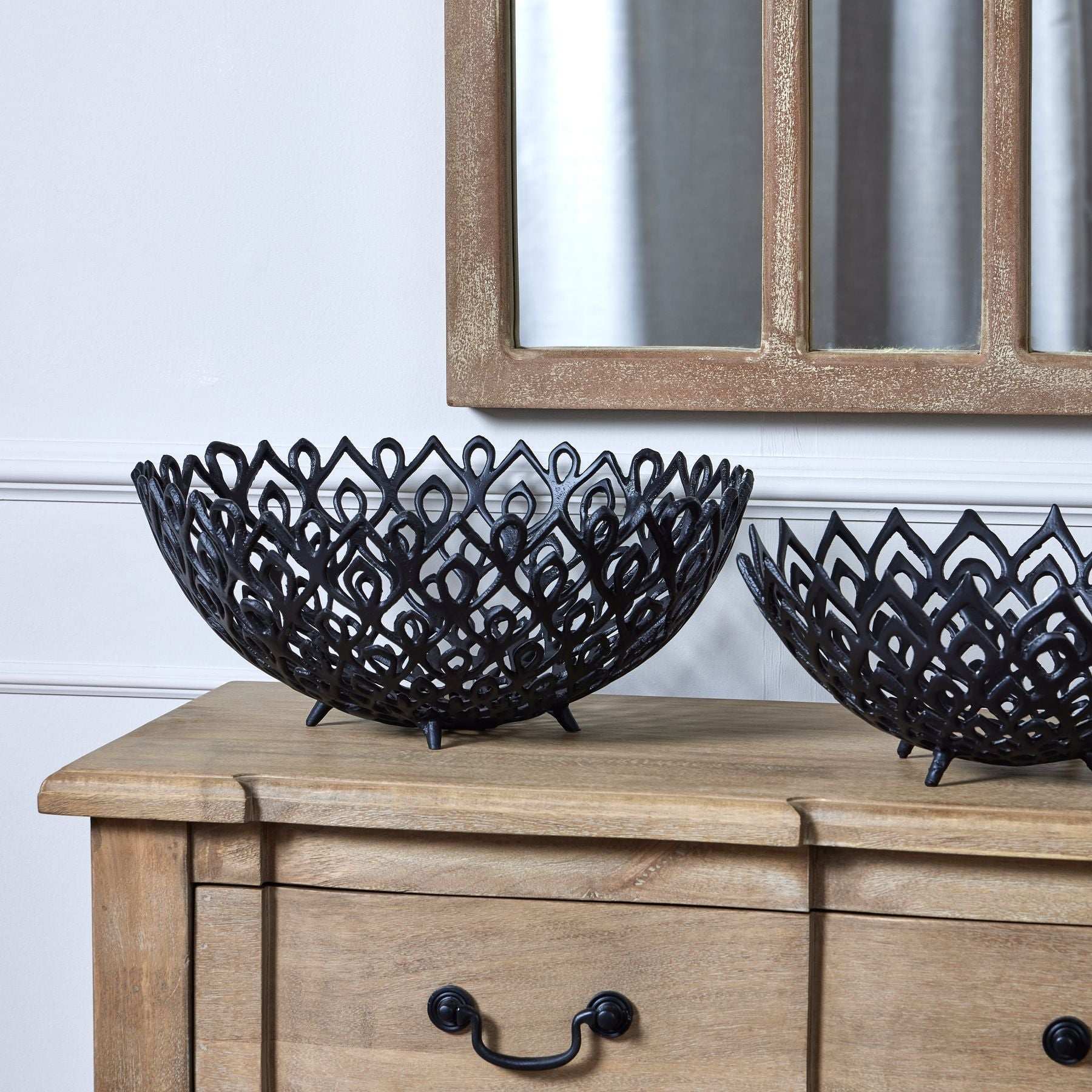 Marvel at the architectural genius of this matt black aluminum bowl, where intricate perforated patterns create a mesmerizing interplay of light and shadow. The contemporary lattice design brings modern artistic flair to any setting, making it an exceptional centerpiece for retail displays and home installations alike. The generous proportions and precise geometric detailing showcase superior craftsmanship that appeals to the design-conscious.