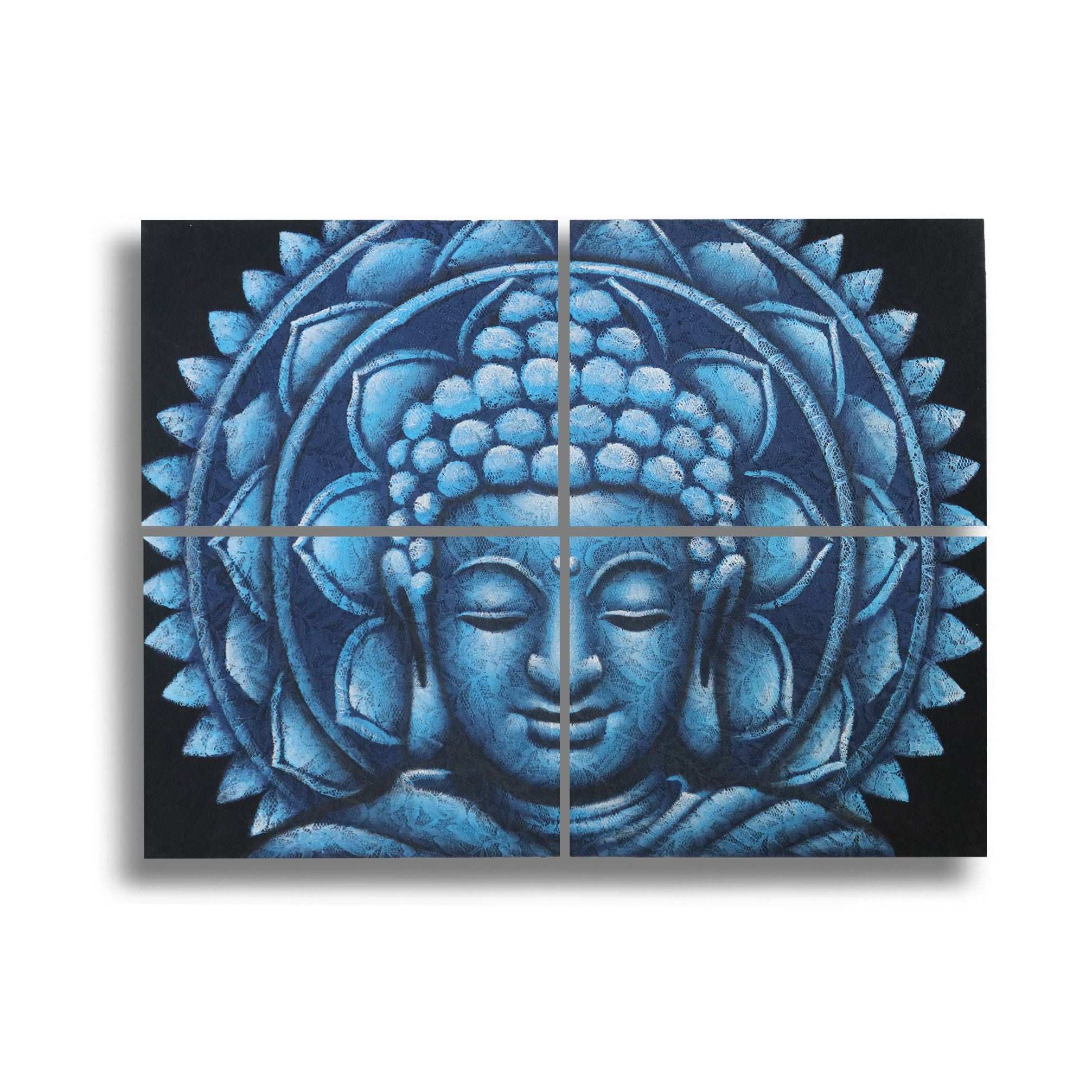 Transform your living space with our Set of 4 Blue Buddha Mandala wall art, featuring stunning brocade detail. Each piece measures 30x40cm, creating an expansive visual impact when displayed together. The artistic depiction of a Buddha Mandala brings a serene atmosphere, elevating any room's aesthetic.
