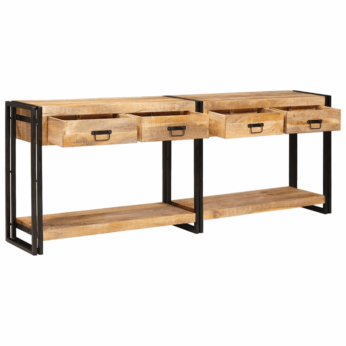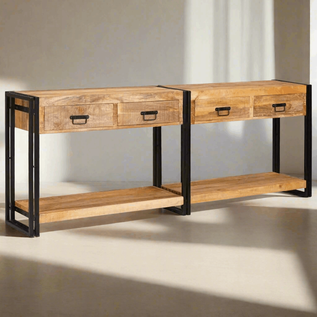 Tough Iron Frame Made from high-quality iron, this console table has a solid and durable frame. The sleek black powder-coat finish adds to its rustic charm, making it last long and resist daily wear. It provides a stable surface for your items, bringing a rugged beauty to any room. Plenty of Storage With two roomy drawers, this console table keeps your stuff organized and easy to grab.