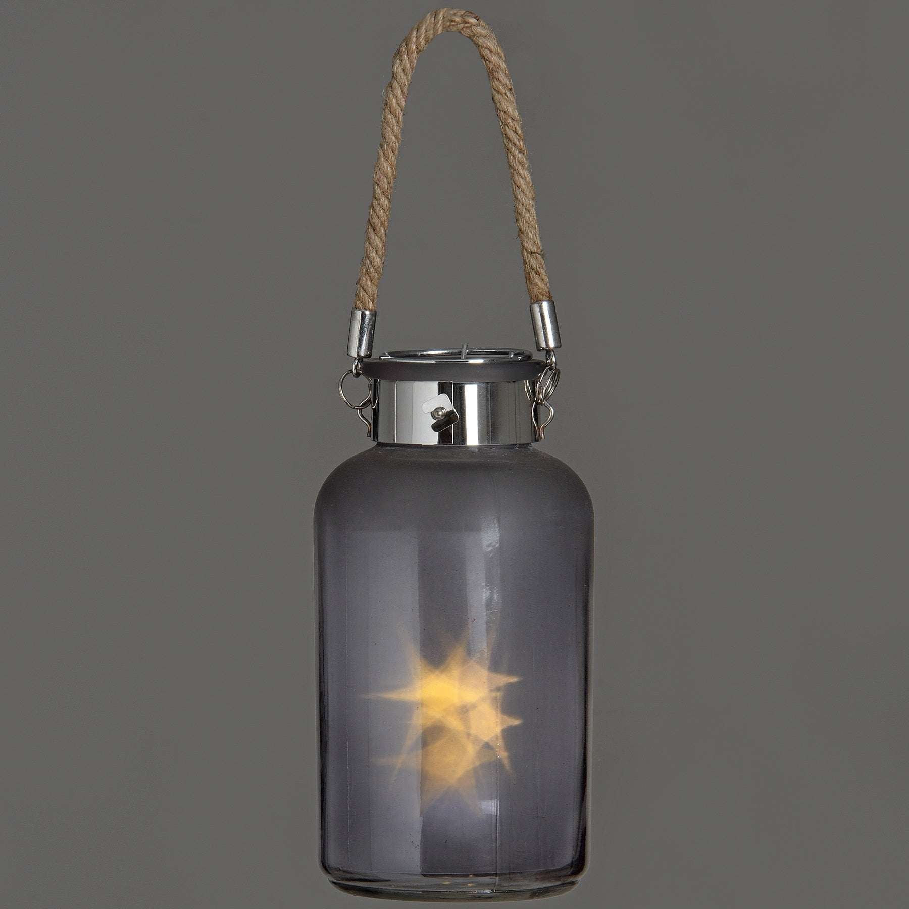 Frosted grey glass lanterns with rope detail handle and internal LEDs. These lanterns are elegant unlit and bewitching when switched on. A string of tiny LEDs coil around any easy to remove metal insert and appear as stars on the jar's exterior thanks to light diffusion from the frosted grey glass. The perfect additions to a create a cosy, atmospheric set-up inside or outdoors. Batteries not included. 1 x CR2032 needed.