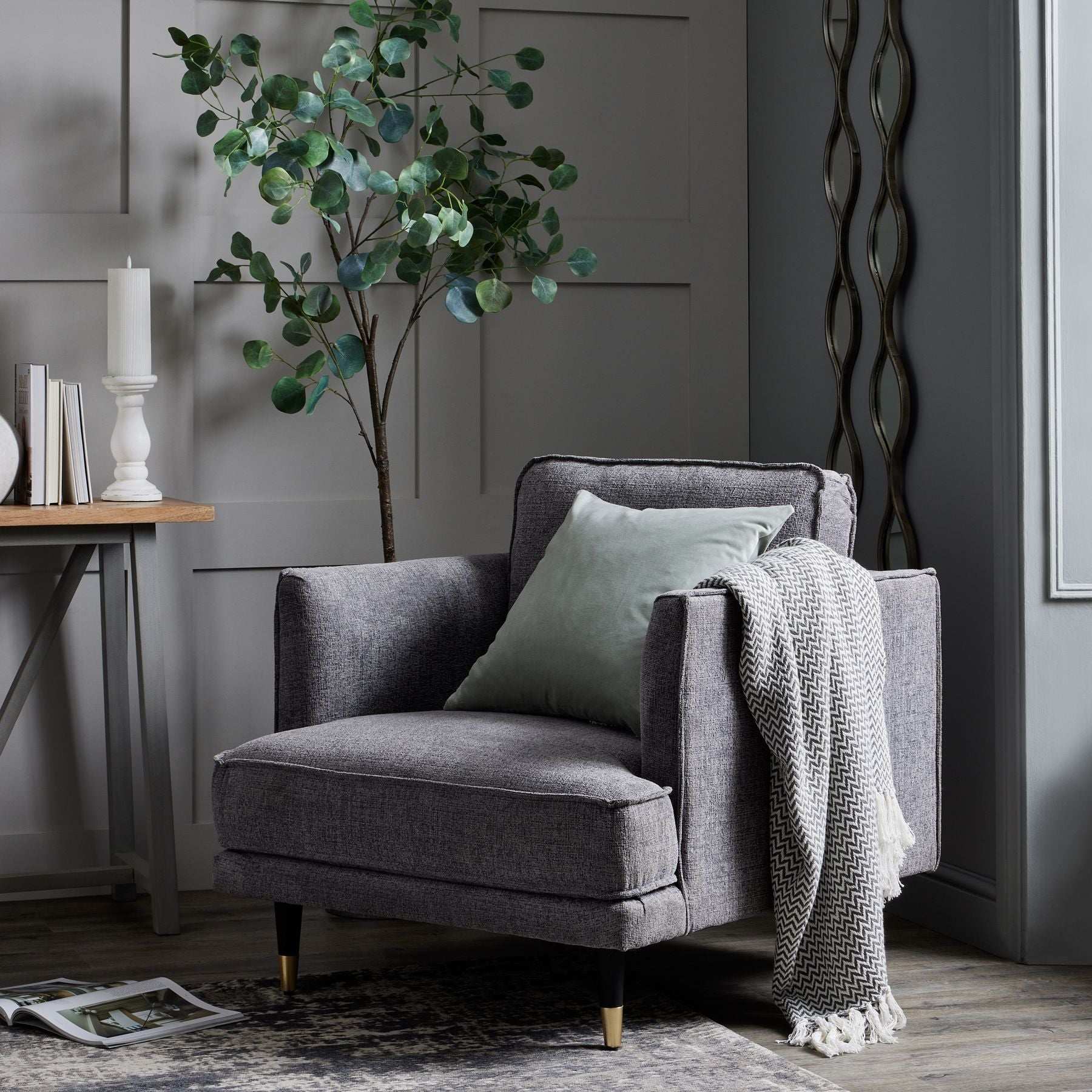This distinguished grey armchair merges modern comfort with traditional design sensibilities. The gracefully curved arms and plush upholstery create an inviting silhouette, while the neutral grey tone adapts seamlessly to various interior schemes.