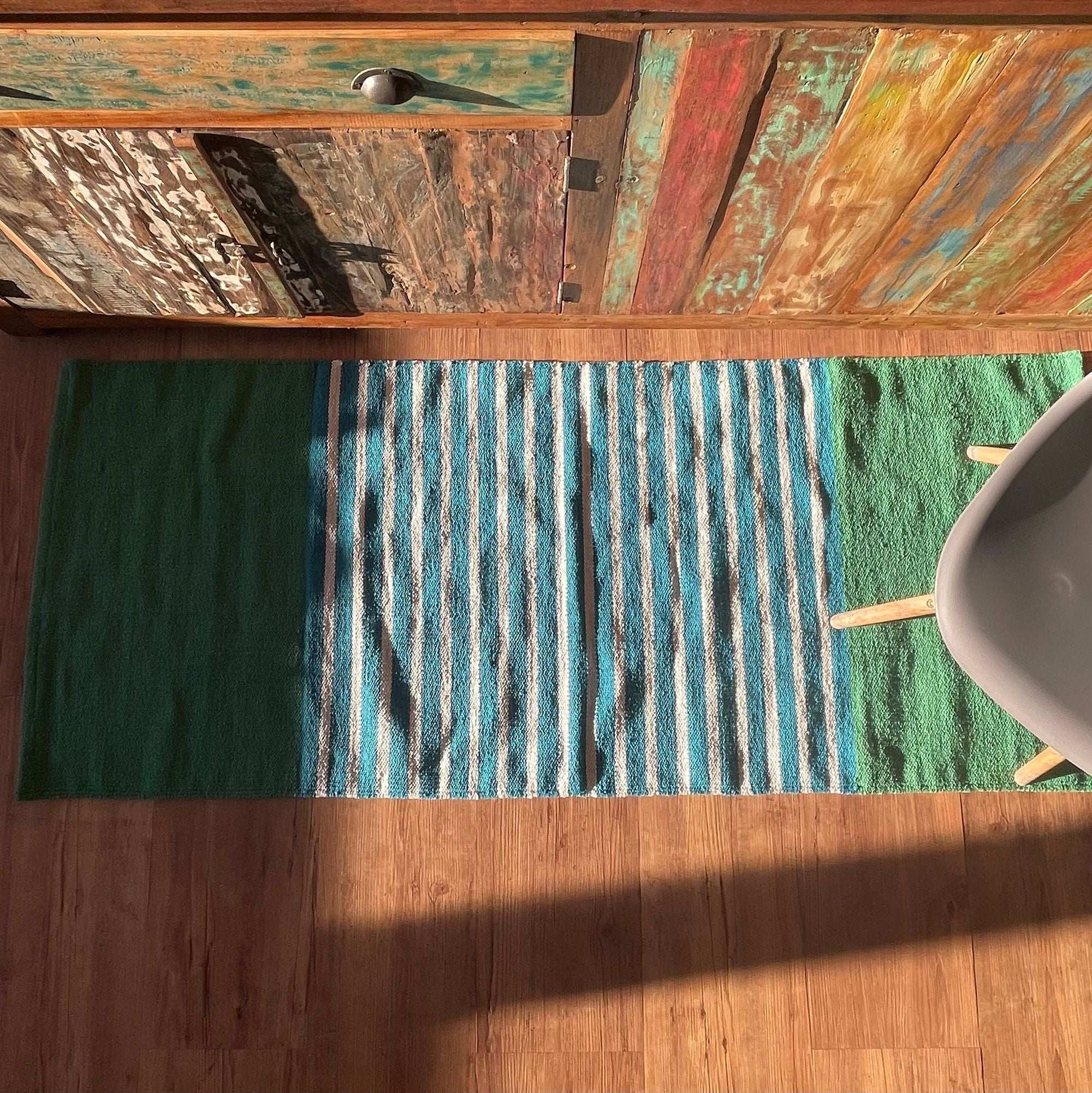 Yoga mat sized green Indian Cotton Rug is ideal for halls, bathrooms, home décor or yoga. Made with 100% Indian cotton by a family business in Panipat. This small city, north of Delhi is known of weavers and famous for its hand crafted textiles.