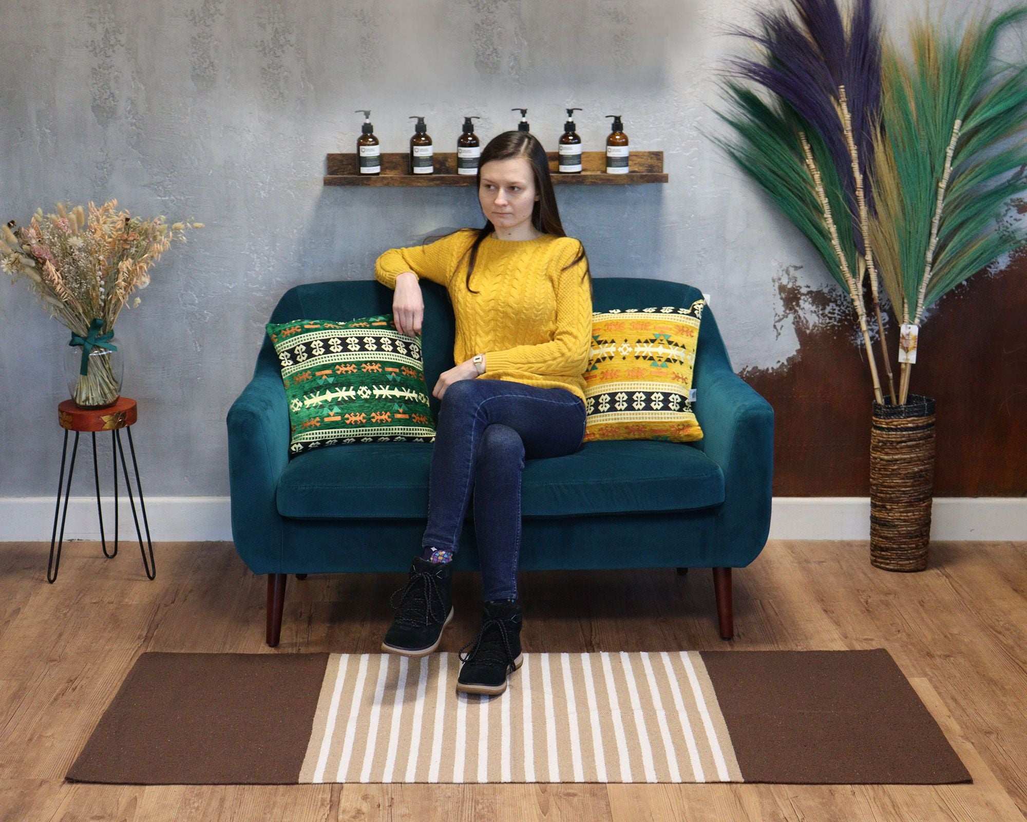 Yoga mat sized brown Indian Cotton Rug is ideal for halls, bathrooms, home décor or yoga. Made with 100% Indian cotton by a family business in Panipat. This small city, north of Delhi is known of weavers and famous for its hand crafted textiles.