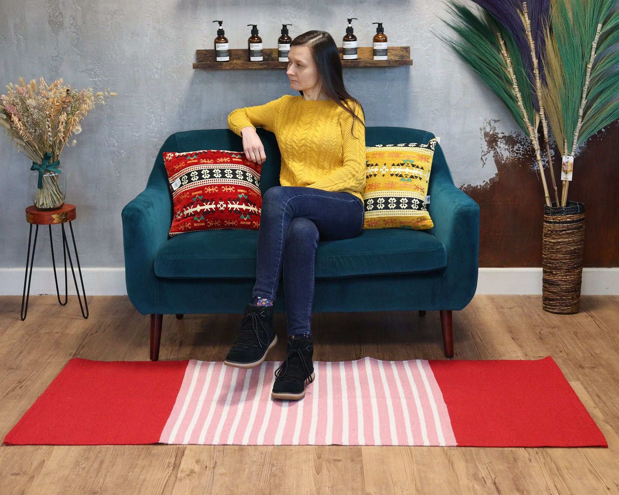 Yoga mat sized red Indian Cotton Rug is ideal for halls, bathrooms, home décor or yoga. Made with 100% Indian cotton by a family business in Panipat. This small city, north of Delhi is known of weavers and famous for its hand crafted textiles.