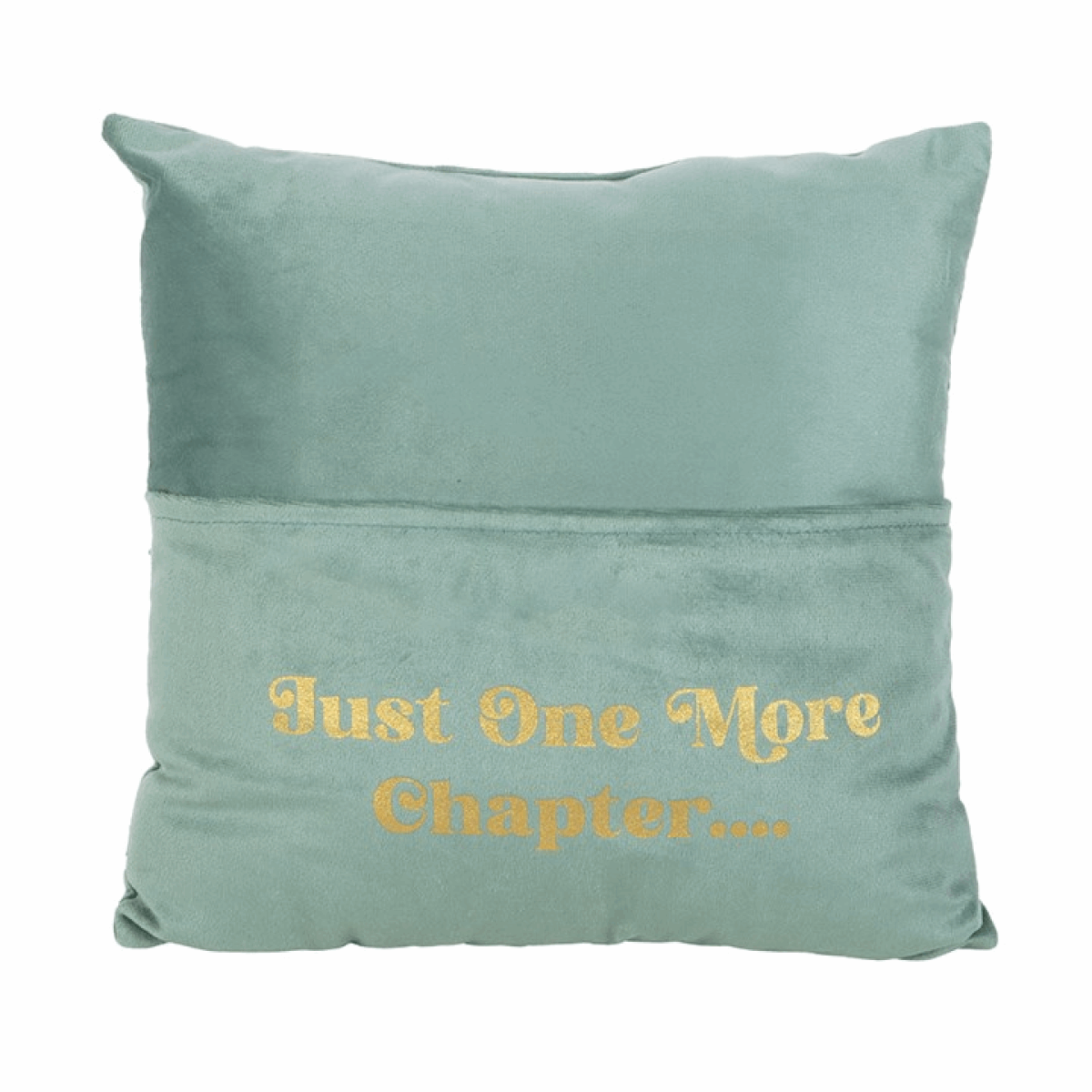 Cosy up with your current read using this soft pale green cushion featuring the phrase 'Just One More Chapter' and a handy front pocket for storing books, e-readers, or reading glasses. Perfect for adding comfort and character to any reading nook, sofa, or bed. 100% polyester.