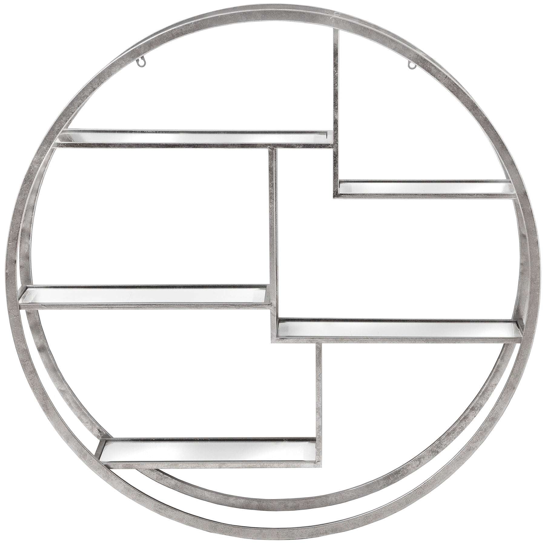 Crafted with an eye-catching circular silhouette, this striking silver wall hanging boasts a modern and geometric design. Its multi-level shelves offer ample space to showcase an array of decor pieces, from sculptural accents to lush greenery, seamlessly blending form and function. This versatile piece can effortlessly complement a range of interior styles, from minimalist to industrial chic, adding a touch of sophisticated elegance to any space.