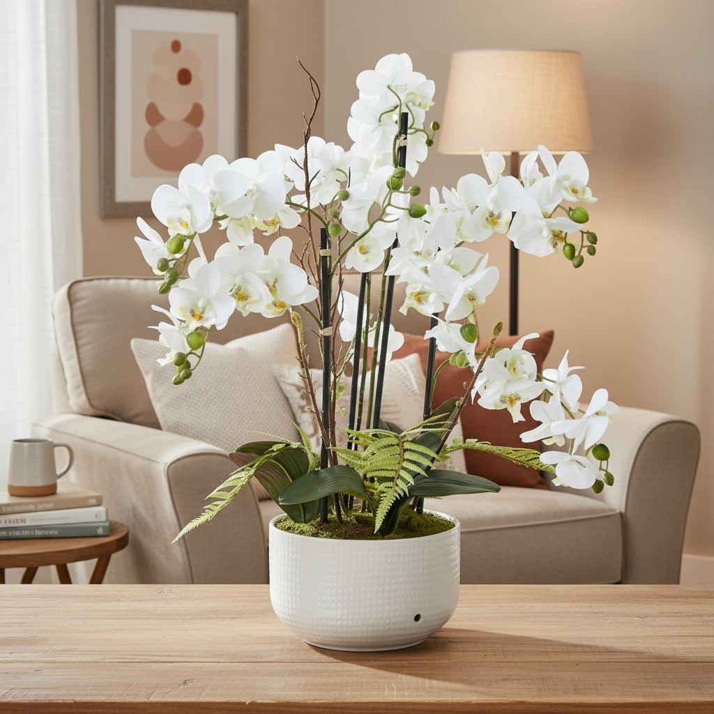 Elevate your space with this Large White Orchid in a sleek ceramic pot. Its lifelike petals bring lasting elegance without the need for maintenance, perfect for brightening any room or office. The stylish ceramic pot adds a modern touch, making this orchid an effortless way to create a serene and sophisticated atmosphere.