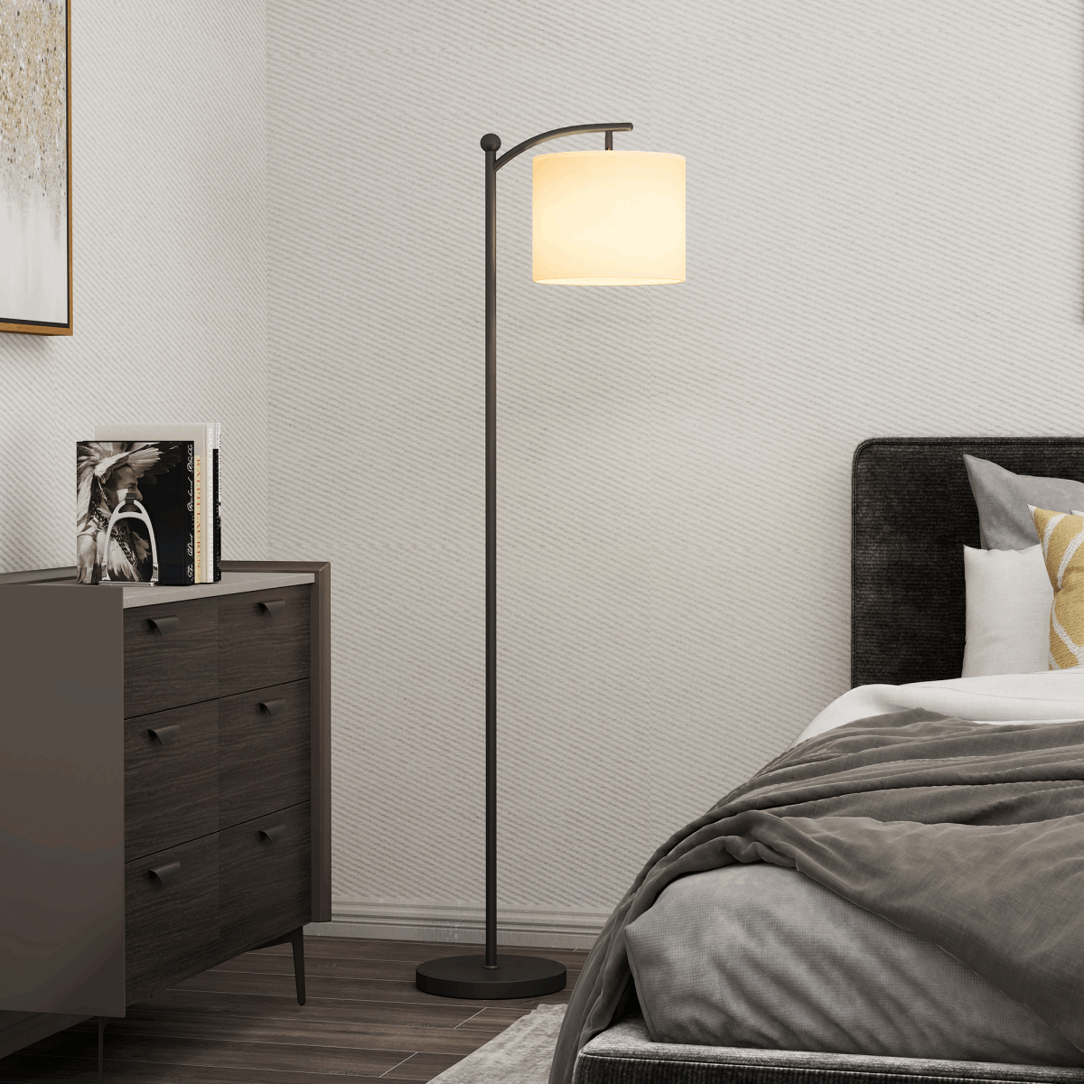 ● Robust metal frame with a baking varnish finish pairs with a stylish fabric shade