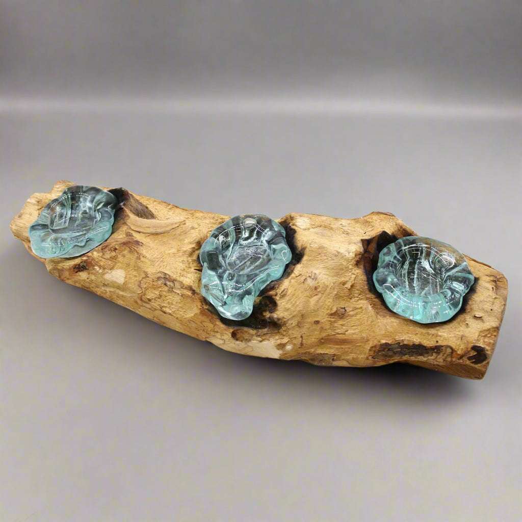 The Triple Candle Holder merges functionality with art, making it an ideal centerpiece for dining tables, mantels, or cozy reading nooks. The unique texture of the molten glass reflects light, adding a touch of sophistication to your decor while the wooden base provides stability and a rustic charm. Perfect for both casual gatherings and formal events, this piece is versatile enough to suit any occasion.