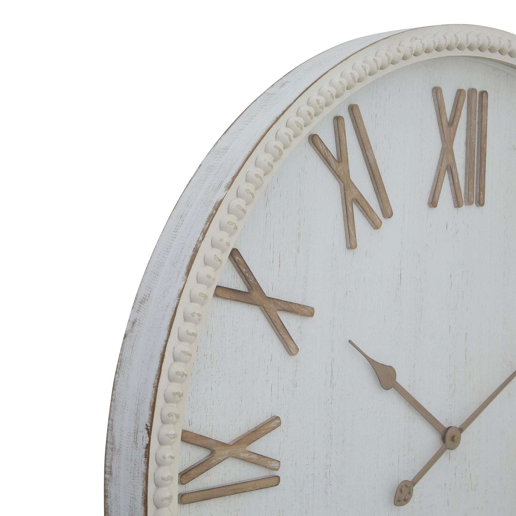 Add a touch of charm to your home with the Large White Rustic Clock With Beaded Frame. This stylish wall clock features a beautiful beaded frame that enhances its rustic appeal. It's ideal for any room, bringing warmth and character to your space.
