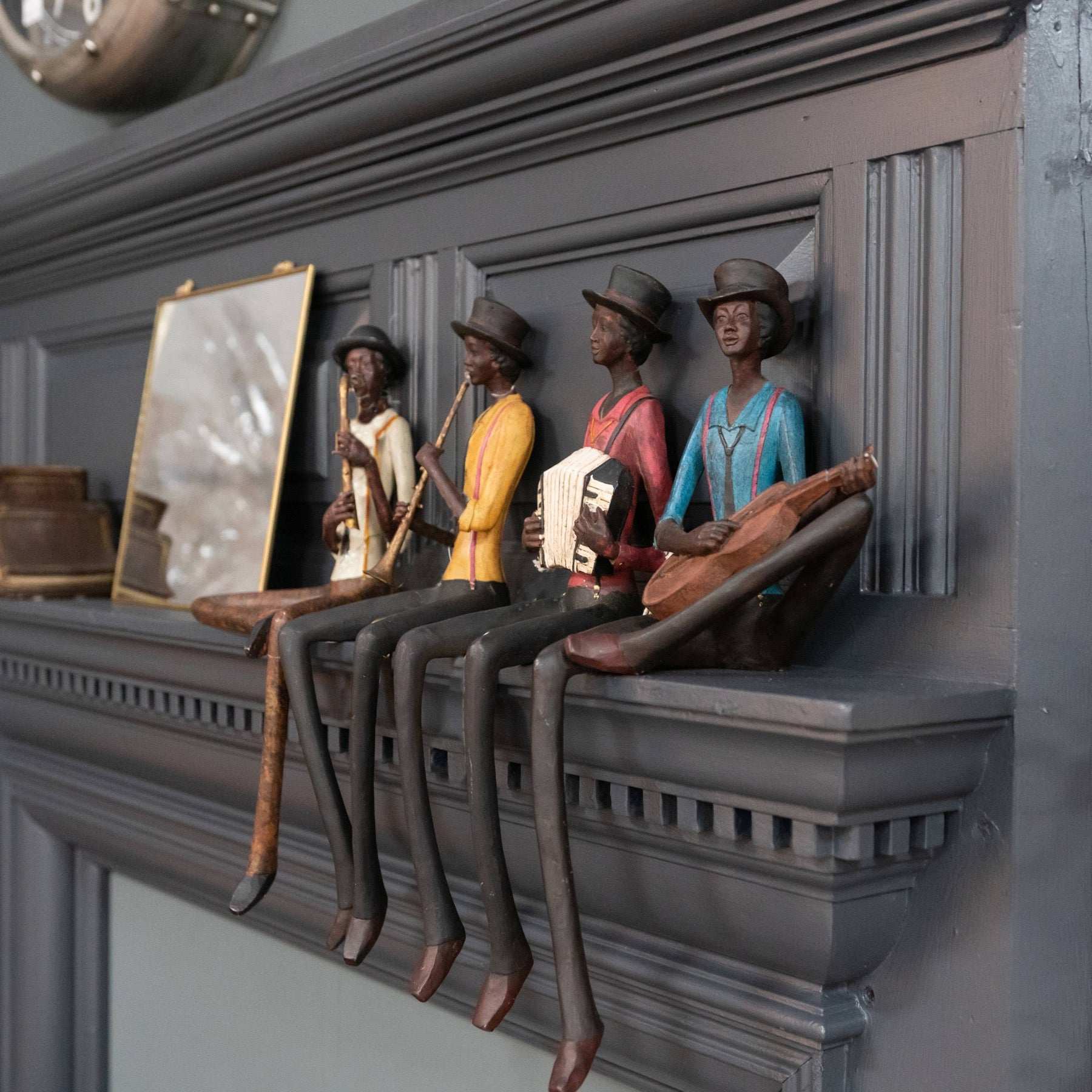 A sitting jazz man, playing the guitar. Part of the 'Sitting Jazz Band' collection. He has a plat surface, with one hanging leg so it can sit on the edge of a surface.