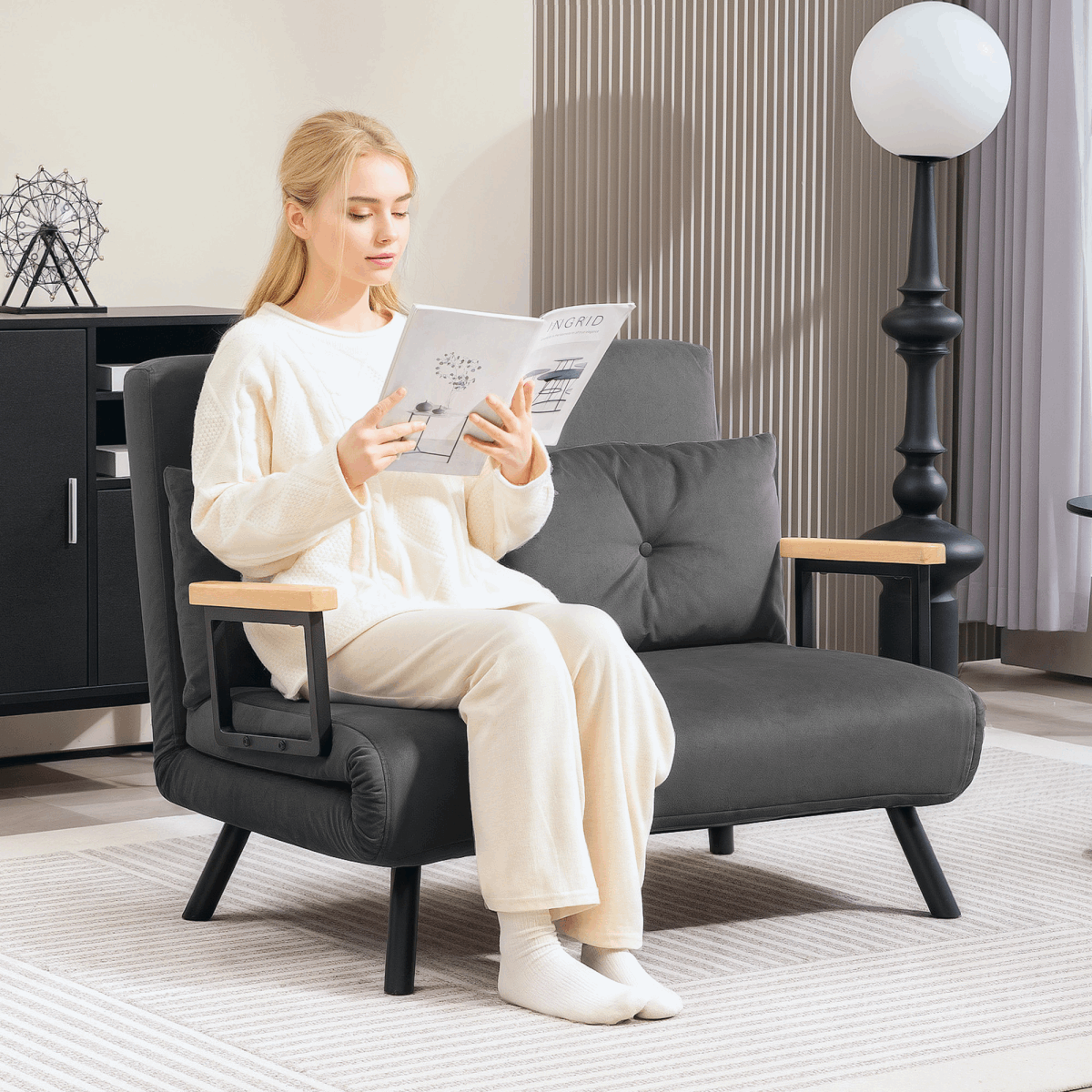 The Sofa Chair features a unique blend of contemporary style and practicality. With its minimalist aesthetic, it can seamlessly fit into your living room, bedroom, or study. The sturdy armrests offer added support, making it an ideal choice for those who enjoy reading or lounging.