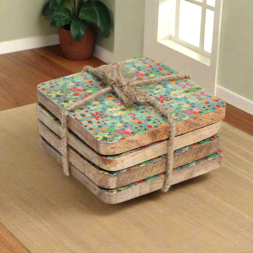 Gift this set to a friend, or enjoy it as an eye-catching upgrade to your own home decor. These Square Coasters suit informal coffee breaks or special gatherings. Enjoy them in any season, all year long. The pack is tied together for easy storage or for giving as a present.