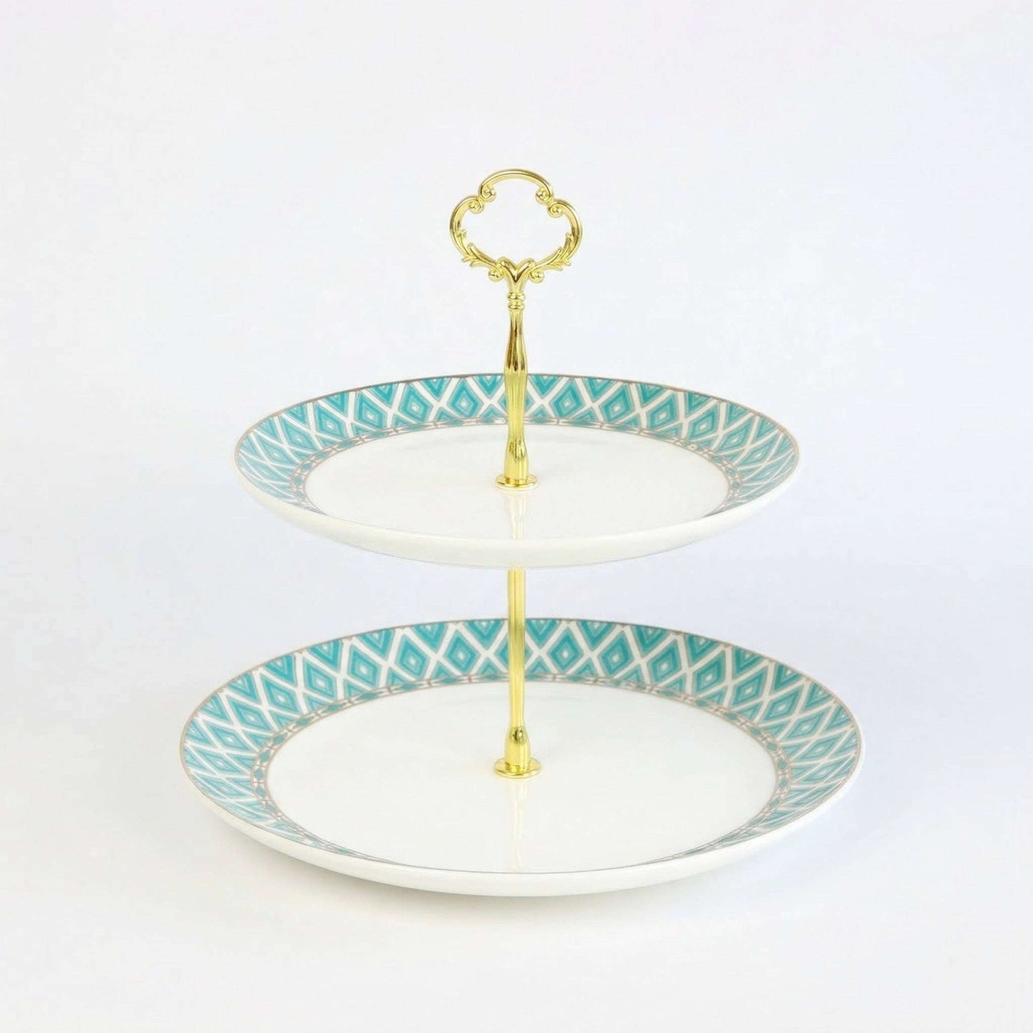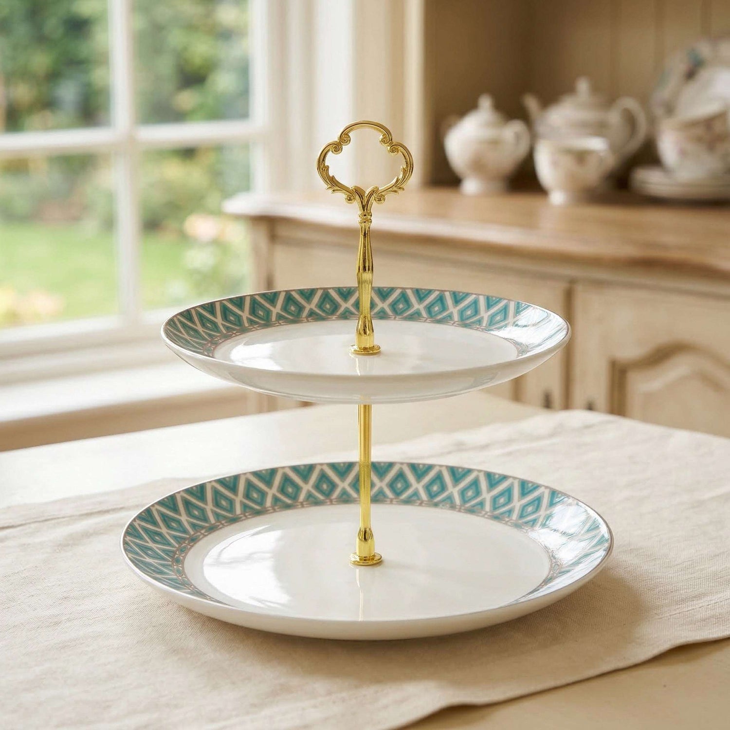 The Edwardian Bone China Cake Stand is a two-tier centrepiece for serving with intention, finished in our emerald Diamant motif and gold-tone detailing. Elegant on the table, effortless to style, it turns everyday bakes into a moment worth lingering over.