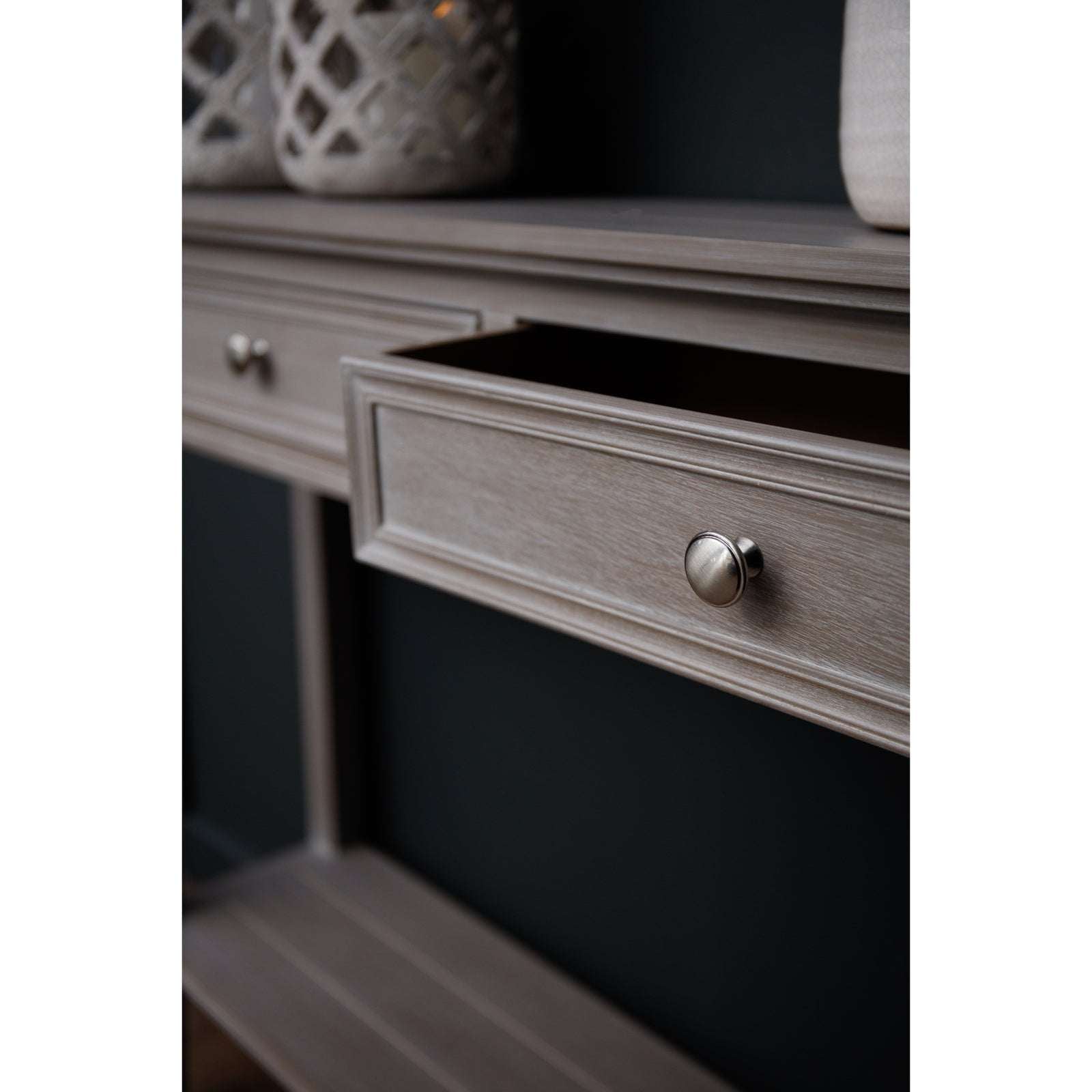 Elevate your entryway or living space with The Serene Collection Four Drawer Console Table, where timeless elegance meets everyday practicality. This sophisticated piece features four generously sized drawers, offering ample storage for keys, mail, and treasured accessories while maintaining a clean, uncluttered aesthetic. Crafted with meticulous attention to detail, its refined silhouette complements both contemporary and traditional interiors. The sturdy construction ensures lasting durability, while the neutral finish seamlessly coordinates with any décor scheme. Transform any room into a sanctuary of calm organisation and understated style with this essential furniture investment.
