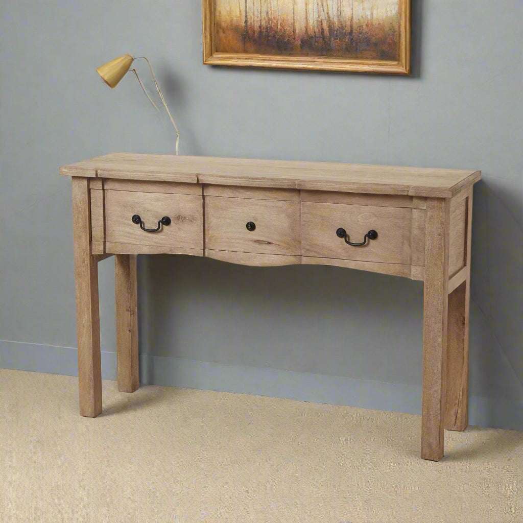 The clean lines and classic design of the Three Drawer Console make it versatile enough to fit in any room. Whether placed in your hallway, living room, or even in a home office, it offers a convenient surface for decorative items, lamps, or personal touches. The natural finish showcases the beauty of the wood, adding to its warm, inviting feel.