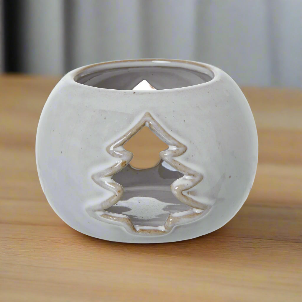 Bring a touch of winter magic to your home with this White Ceramic Tree Cut-Out Round Tealight Holder. Its smooth ceramic surface has a soft white finish that looks clean and fresh. The charming tree-shaped cut-out glows warmly when a tealight is inside. This design suits many decor styles.