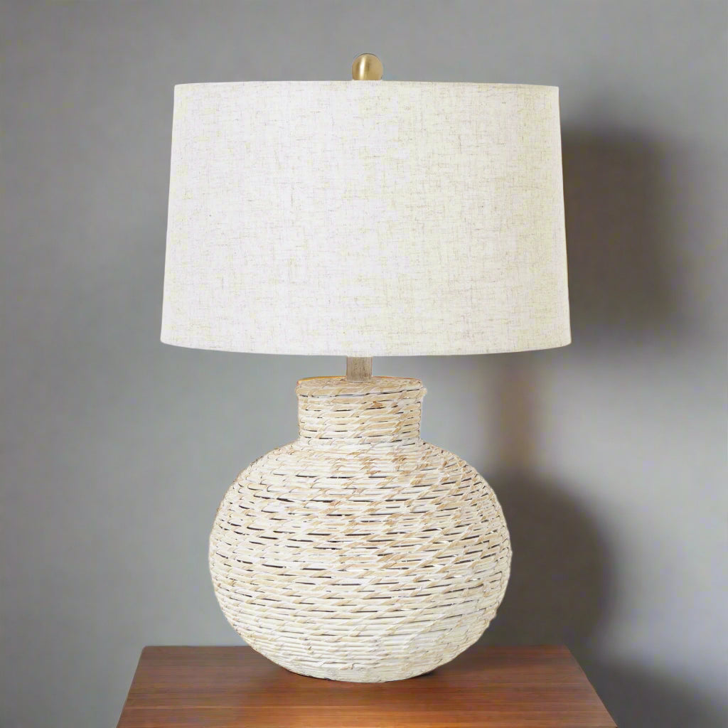 This stunning White Wash Bulbous Wicker Table Lamp with Linen Shade is a captivating piece that effortlessly blends rustic charm and modern elegance. Crafted with intricate woven wicker, the lamp's bulbous silhouette offers a unique and eye-catching presence that will instantly elevate any space. The neutral white wash finish lends a fresh, airy aesthetic, while the linen shade diffuses a warm, inviting glow. This versatile lamp seamlessly complements a variety of interior styles, from farmhouse-inspired to contemporary settings. Pair it with natural wood tones, soft textiles, and verdant greenery to create a harmonious and inviting ambiance. Its compact size makes it an ideal choice for side tables, entryways, or as a bedside companion, providing both functional illumination and captivating visual interest.